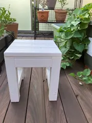 ミニベンチ ■作品内容ミニベンチ ■こだわりポイント野菜畑ゾーンでひときわ目立つようにピュアホワイトの塗装を施した。見慣れた色ではあるが、新鮮でかわいい。本来の原型は二本の脚をつなげて底辺の平面が二面できるようになっているとのこと。しかしながら、屋外で使用する場合、凹凸の土地だとかえって固定しにくい。