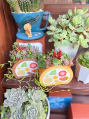 ■作品内容おうち型多肉プランターを手直ししました🎶■工夫ポイント知り合いの方に夏前にこちらの寄せ植えを譲ってほしいと言われたのですが、夏越しが不安とのことだったのでお渡しは気温が落ち着いてからということにしてそれまで我が家でお預かりしておきました❣️何とか酷暑を乗り切って、その方からご連絡をいただき