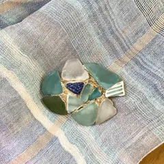 金継ぎのブローチ 漆を使って陶器を修理する金継ぎは敷居の高いものだと思っていました。今回は異種の素材を繋げる呼び継ぎという技法、漆の代わりに樹脂を使うというお手軽でリーズナブルなWSなので参加しました😊まずたくさんのシーグラスと陶器の破片から選んでレイアウトし、接着剤で仮止めします。次に隙間を樹脂で埋めるのですが、す