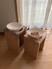 犬の背丈に合わせたフード皿置き フード皿はサラダボールとココット皿の底を接着剤でくっつけて防水シール(バスボンドQ)で剥がれにくくしました。木材を犬の足の長さに合わせて切り、フード皿を乗せる所は丸く切り抜き、切った木材を釘でとめて作りました。