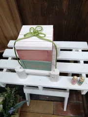 枡箱ひな重ね 箱の色と梅結びに魅了されてしまいました。春らしい黄緑色と桜色がお雛様にとってもよくあって色紙も可愛い❤です😊梅結びを教えて頂きました✨とっても勉強📚️になりました。ありがとうございます。