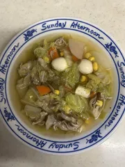 ちょっと肌寒いので家に残ってる野菜など使ってコンソメスープを作りました😄コンソメ味なので何入れても美味しい😋です🎶私の好き❤️な黒胡椒をかけていただきます😄
