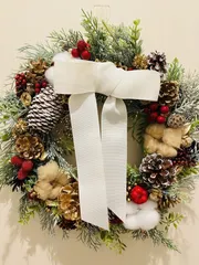 ■息子と夏休みのアサガオをつかったリースでクリスマスリース作成しました✨■工夫ポイント息子が夏休みに育てたアサガオでリースの土台をつくり、装飾は100均の材料を使用しました。リボンは赤と白で迷いましたが、息子のチョイスで白に決定🤍 小学一年生の息子と一緒にリースを作成しました。2人で赤い実