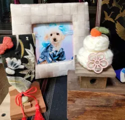 ■作品内容今年はちょっと編み物ブームいろんな物がSNSに出て来ますお手軽に毛糸揃えられる時代編んだ鏡餅もなんか可愛いかも🩷小さな手づくり羽子板と愛犬の写真と飾ってみました🎍♥️■工夫ポイント小さなみかんは羊毛フェルトで作り100均の鏡餅台は木目をいかした塗料( 超撥水ブラック)で端材で購入した木の台