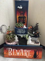 ハロウィンの為に作った物達。出番で〜〜す。 昨日作った ◯ハイポネックス社服部先生 秋の可愛らしい鳥かごの寄せ植え 季節外れに作った◯ポーチプランターHaunted House Small Planter/お化け屋敷◯サインボード ロングAHALLOWEEN - Beware 昨日カインズで買った 草花達〜 &