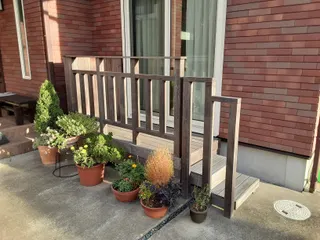 ウリン材でウッドデッキを作りました。 ■作品内容掃き出し窓の前に、小さなウッドデッキを製作しました。手すりと階段付きです。■こだわりポイントハードウッドのウリン材で作りました。無塗装で20年腐らないと言われていますが、硬い木材のため、ビスの下穴開けドリルビットが3本、ビスが10本以上破断しました。側面の立ち上がり壁の裏側に、清掃用具や園