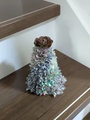 ふわふわリネンのワイヤーツリー ■作品内容ワイヤーにリネン生地を通して優しい感じのツリーに仕上げました。中にライトを入れるとほんのり灯りがもれて優しい雰囲気を醸し出してくれます。■工夫ポイントツリーの出来上がりを考えてリネン生地は2色にしました。そして、ワイヤーに通す長さを3m.2m.1mと段々短くしていきました。■使用した商品ア