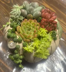 ■作品内容先日イベントで購入した多肉を寄せ植えにしました ■工夫ポイントセダムを纏わせながら植えてみました 何とか可愛く見えるかなぁ
