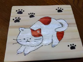 かまぼこ板でコースター かまぼこ板を沢山取ってあっても特に作品に使ってなかったので2枚をボンドで貼り合わせてコースターを作りました😊どうせならネコちゃんを描いてと思いましたが絵心がないのでイラストをティシュに映して描きました😅肉球は手書きしました😉子供の時に父に買ってもらった彫刻刀が見つかったので肉球とネコちゃんを少し彫っ