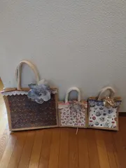 ジュートバッグ🛍️ ■作品内容 ■こだわりポイントジュートバッグ🛍️にペーパーナプキンを貼ってニスを塗りました。レースをあしらい可愛い❤お花を付けてみました。