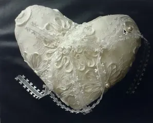 リングピロー ■ウエディングの時の結婚指輪をおいておく小さなクッション ■ホワイトレースのリングピローをハートのかたちで。リボンで指輪を止めます。
