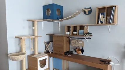 簡単キャットウォーク BOXやミニBOXを利用してキャットステップを作りました♪左上のBOXとはしごは手作りで、色も塗りましたが、他の棚受けと棚板とBOXはすべて市販のものを利用しています。市販のキャットタワーを横に置くことで、猫も簡単に上り下りできるようにしています。何かあると一番上のカラーBOXまで行って見下ろしてい