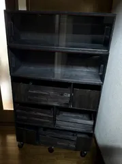 引き戸付き収納棚 塗料は、エボニーブラックです。リビングは、この色が多いです💓棚を2つ重ねて、下には、目隠しフェンスと、色んな物をコラボしてみました。扉は小さい木材を貼り合わせて作りました。キャスターを付けて移動出来るようにしました。扉は小さい木材を貼り合わせて作りました。キャスターを付けて移動出来るようにしました。