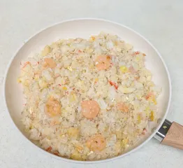 カインズのセラミックフライパン(26cm)をおろしました✨海鮮チャーハン作りました🦐🦑今までのはこびりつきが出てきたので、新品のフライパンはノンストレスで嬉しいです♪