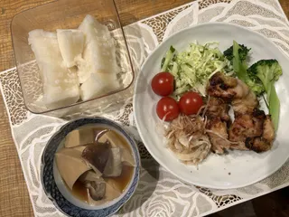 朝ごはん ①フライヤーで焼いた鶏の唐揚げ (30分ほど前に、焼肉のタレに漬け込んで、ザルにあげておく) 冷めても美味しい唐揚げ粉を満遍なくまぶしたら、フライヤーの中へ。 180度で9分。 もう、片面も9分 で完成 キャベツは、千切りして、30秒のレンチン。 きゅうり🥒は、塩ズリした後千切りして、キ