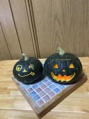 むかーしに一度作りましたが今年久々に義母さんが作ったカボチャ豊作だったので2個もらい、くり抜いて作りました❣️小さい方はシールで顔作りました‼️2歳児の生徒が喜んでくれますように〜😉中にはリアルキャンドルは🕯は危ないので電気のを入れました🎵