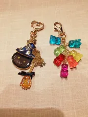 ハロウィンらしく。 ハロウィンの季節になるとどうしても作りたくなるハロウィンらしいレジンアクセ。1つ目はUVレジンで作った魔女ネコキーホルダー。にゃんとリバーシブル!帽子もホウキもネコちゃんも裏表あり!ホウキはハロウィンらしく蓄光フレークまぜまぜ🤩ちょびっとワルい顔✨お次は某固いくまさんグミ風キ