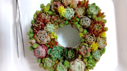 多肉のミニリース寄せ植え 📏置いてみました😊ババロア用かな❓️100円ショップ手作りお菓子のコーナーにあるドーナツ型の物に穴を開けてリース製作に昨日から取りかかったのですが🤣夕暮れと共に集中力が切れて放置💦今日は風が強くて🏠室内でチマチマ☺️Tagさんのあとに投稿するのは勇気が要りますが(笑)寄せ植えは自己満足😝私なりにチビ