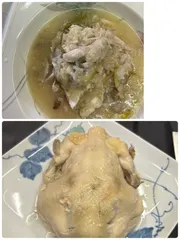 参鶏湯(サムゲタン) 鶏肉1羽 鶏肉全体に塩麹を塗りつけて、揉み込んでおく。お腹の中に洗って少し水に浸けて、ザルにあげた餅米をつめます。 鍋に、その鶏肉と 水 800cc、 酒 大2 と、 塩麹大2 おろしニンニク小2 おろし生姜大2 と、5センチ位に切