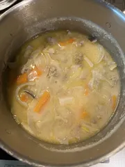 クラムチャウダー めちゃ簡単です。作り方はクリームしちゅーと同じですね。 キャベツ、玉ねぎ、きのこ類、人参ベーコンの代わりに豚バラを入れましたが。 全ての材料をお鍋に入れて、油をしき、炒めます。切り方も、口に入る程度なら好きなようでいいとおもいます。 しんなりしたら、水200ccと、牛乳400cc 煮立って