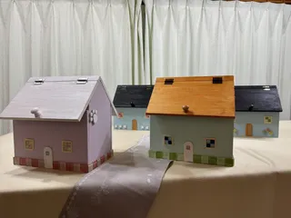 4軒の家 ハウス型小物入れにモザイクタイルを貼り益々可愛いなぁ🩷と眺めています😻木材は、100均の物を使用し端材が出ないように使い切りました。以前作ったものより小さいです。ワンちゃん、ネコちゃんのおやつ入れにちょうど良い感じ🙆