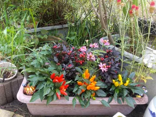 ずっとポットのままだったのをやっとプランターに植えられました!ニチニチソウもまだいける!ハロウィン飾り探してみてください😻ニチニチソウの寄せ植えの後ろにコリウスの挿し木(水挿しして根がでています)を入れました。鉢の隙間を埋めてくれるかな?
