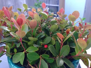 雨上がりの庭パト① 雨がやんで今日は快晴☀️早速、庭の草木の点検しましたまずはチェッカーベリー🍒葉っぱは元気、調子良いわ😊あれ、何か、あれ?実が1個しか無い😨調べてみたら、花が咲いた頃に雨に当てないほうが良かったらしいです😥去年、たわわに付いてたのになぁ😒