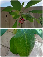 雨上がりの庭パト② 近所のスーパーのお花屋コーナーでお値下げになってたプルメリアです300円くらいだったかな?お花が咲いてないので仕方ないんだけど、どの色が咲くのかわからない😅しかも初めてのプルメリア、上手く管理できるかしら🤔そんなにカンカン照りでも無かったしガーデンパラソルの下だし、外に出してたら葉に白い斑?が出てき