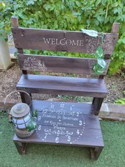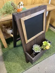 黒板付フラワースタンド 黒板の額縁はノコギリ斜めカット、なかなか四隅がびったりいかなかった、、😢💦色はウォールナット❣️本体は久しぶりのダークブラウンでお気に入り❣️