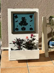 黒板付きフラワースタンド ハロウィンが終わる前にupしなくては!黒板付きフラワースタンドを作ったけれど、黒板にチョークで書くセンスがないので、セリアで買ったシートを貼ってみました😊キレイに剥せるか心配🥺