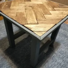 ヘリンボーン柄の天板おしゃれに見えていいですよね😊 ダイニングテーブルを作るのが目標ですがなかなか大変そう。 私もきっちり合うように作りたいです😄