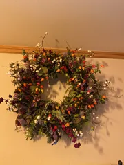 冬も明るく 短かった秋に実物の花材をあまり集められなかったのですが、スーパー隣の花屋さんで、カラフルなちび唐辛子をモリモリ見つけました。家の庭から葉物、去年は使わなかったので眠っていたナンキンハゼを枝も活かして明るいリースに。