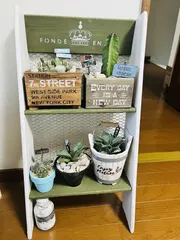 ラダー二段 5枚で300円の板を買って、4枚で庭テーブルを作り、残り一枚でラダーを作ってみました😊斜めカットして背面も壁の角度に合わせてカットしてあるのでズレる事はありません💪 考えて工夫して自分しか読めない設計図を書いて作業に入るの、とーっても楽しくてやめられません😆
