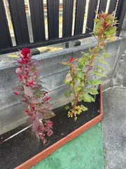 ひと月前に投稿した零れ種けいとう(リンク→ https://diy-square.cainz.com/announcements/mp0oowmh0tibx5u9 )、今日も赤々としてます。葉っぱは、穴だらけですけど。