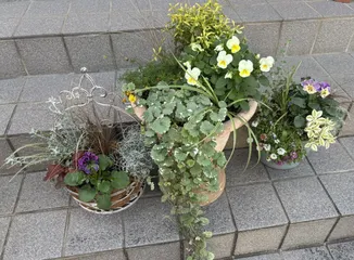 なんて素敵な寄せ植えなのかしら✨ 鉢もシブいですね❣️ガーデンシクラメンの色と対比してお互い引き立てあってるのが良いですね😊