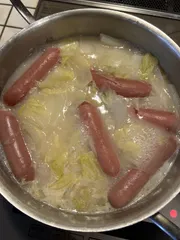 白菜と玉ねぎとウインナーのクリームシチュー クリームシチューの味付けは、ルーが4人分あったので、それをつかいました。 ウインナーを入れるときっと、美味しいだろうな‼️と勝手に投入‼️結果、めちゃ合ってて美味しかった‼️ 亜月のクッキング🍳