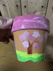 今日の作品【素焼き鉢ペイント】 【桜の花と菜の花】のつもりで、本人は作りました。 桜の花はゴムハンコで押してみました。下の黄色は菜の花のつもりです😊
