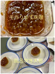 ゆず味噌乗せの風呂吹き大根 大根は別の鍋で湯がきます。 15分程で柔らかくなりますので、トッピングにゆず味噌を乗せて食べてください。 ゆず味噌の作り方は、以前のレシピで投稿しています。 とてもさっぱりしていて、無茶苦茶おいしいですよ。 亜月のクッキング🍳