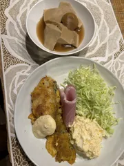白身魚のチーズ入りパン粉でフライ風と、高野豆腐の煮物