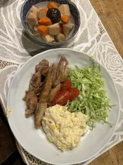 鶏もも肉の照り焼きと根菜類の煮物 鶏もも肉の味付けは、塩麹に漬け込んだあと、細長く切り込み、フライパンにオリーブオイルをしき、ニンニクてわ香りをつけて裏表、焼き目が付くくらい、炒める。甘だれを大3〜4杯掛け回しながら、染み込ませたら完成。 キャベツの千切りは、ラップをふわっとかけて、レンジで1分20〜30秒 野菜のそのものの、甘さ