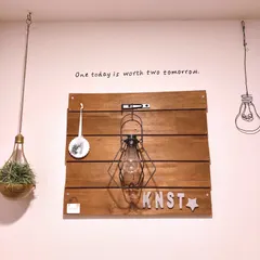 玄関に電球タイプのライトを取り付けたくて、ウッドボードを作ってみました! 木の板を塗料で塗って、少し重ねて鍵で止めて デコレーションペイントで英字も作って壁に貼って♪(黒い文字)黒いワイヤーで、吊り下げタイプのライトも作りました手作り感満載ですが💦愛着湧いてます😍