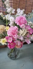 2回目のお花と一緒に生けてみました。器の口が広いので、カーネーションの茎を間に。3回目のお花で。ピンクのカーネーション黄色のスプレーカーネフリージアコデマリ 2回目のお花。菊・スイートピー・ガーベラ・ストックがまだ元気だったので。まだまだ、楽しめそうです。😺