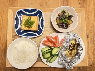 昨日は鮭のホイル焼き、カット野菜、ナスの中華和え、焼き厚揚げです😊お野菜も安くなってきたので献立も考え甲斐がありますね♡