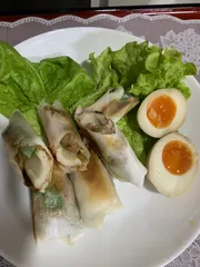 ミニ春巻き 今日は、一日中出てたので手抜き飯 の一品にミニ春巻きを作りました 具は、買った焼き鳥、半分のチクワ、紅生姜、自家製のパクチー を春巻きの皮で巻きフライパンでコロコロと転がして焼いただけです昨日、仕込んだ煮卵を添えて