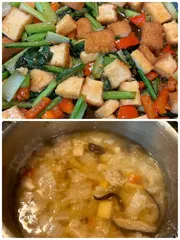 クリスマスカラーの中華炒めと朝のお味噌汁 おはようございます‼️今朝の朝ごはんです。材料 小松菜1束、モチモチ厚揚げ2枚、カラーピーマン1個 調味料 ごま油、酒、 みりん、 砂糖、 オイスターソース、 おろし生姜(チューブでもいい) 鶏ガラの素、 中華味の素 ※ 初めから