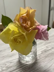 バラ🌹3色 庭に咲いていたバラの花、風に揺れて寒そうにしていたので、なかよく家の中に入れてあげました🥹