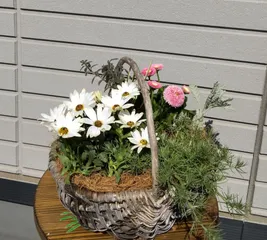 かごの寄せ植え 上から空いているかごがあったので 昨日はもう一つ寄せ植えを作りました💕こちらの白はディモールフォセカ 少し黄色が混じっています オステオスペルマムとの違いが良くわかりません😅デージーは赤と白の混じり💖手前の水槽の藻みたいのは ロータスコットンキャンディこの3つが新入りさんです他は