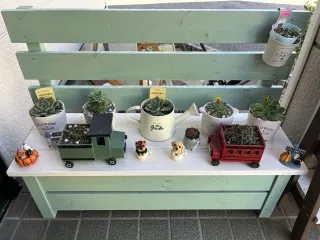フェンス付き木製プランターカバー こちらの作品、二つ目です。 どうしてももう一つ玄関前に置きたいなと思い、やっとWSが開催されてとっても嬉しかったです。 全体的には、超撥水のグリーンに、蓋を自宅で作りこちらは、超撥水のホワイトを塗りました。 中には収納でき