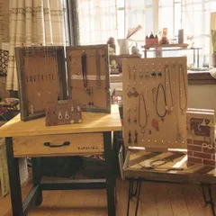 引き出し付きサイドテーブル WSで作ったテーブルにイベントに出すアクセサリーを飾ってみました^ - ^右のテーブルは自分でヘリンボーン天板を端材で作りアイアン脚をつけました♪