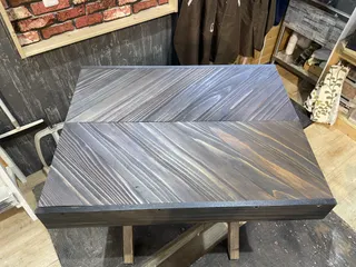 DIYも少し慣れたところで折りたたみテーブルを作りたいなと思い相談したところヘリンボーンのテーブル勧められて作ってみました。スギの木目が黒系の塗料にマッチし満足の出来上がりです。